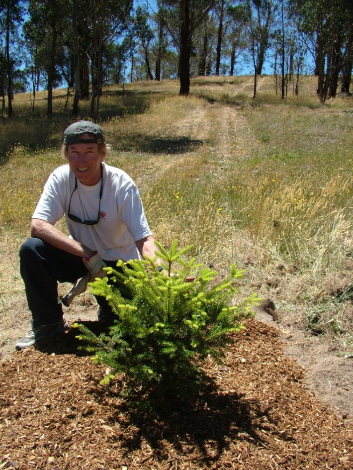 Mark Watchorn with the first of the twin Ponderossa Pines planted as a gateway to the Gigantium Corridor 2009.